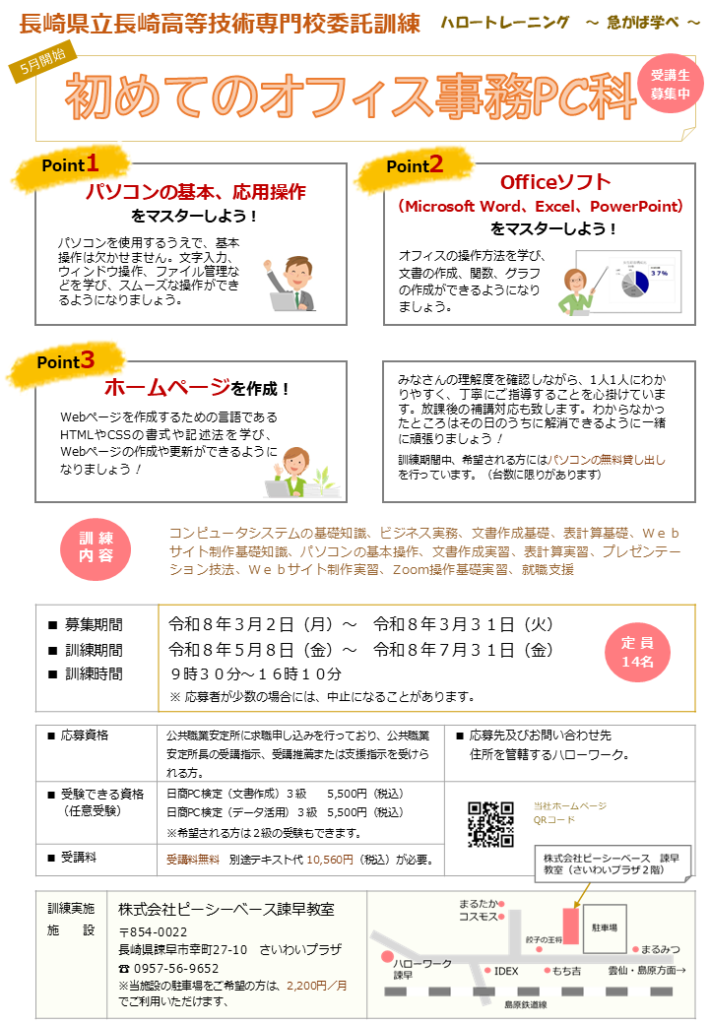 【受講生募集中】◆諫早◆ 5月開始 公共職業支援訓練「初めてのオフィス事務PC科」